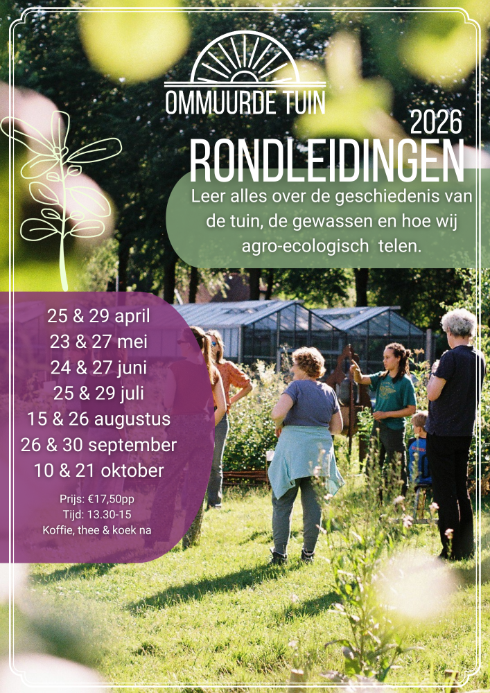 The Ommuurde Tuin is a beautiful 1-hectare garden at Oranje Nassau’s Oord estate between Renkum and Wageningen. We are part of a network of farmers and movements that demonstrate it is possible to farm without chemicals nor artificial fertilizers, and it can be done in connection with the local community and dedication to support the flourishing of the land. The Ommuurde tuin is a space to learn, celebrate, experience the beauty of diversity, feel the roots beneath our feet, connect to ourselves and each other, and a space to simply breathe. We organize events, courses, and educational activities throughout the year. Visit our website, stop by for a chat, or join a guided tour to learn more!
