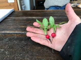 De veldsla is vaak al in april oogstbaar en moet ik ze eerder zeggen wat langzaam te groeien om niet te ver te zijn als in mei de pakketten beginnen. Maar dit jaar ben ik blij dat ik ze al in de tweede week in het pakket kan doen. Veldsla heeft een lekkere nootachtige, zelfs bloemige geur. Omdat deze veldsla van de vollegrond komt ipv uit de kas zoals de meeste veldsla in de supermarkt, moet je hem wel goed wassen.