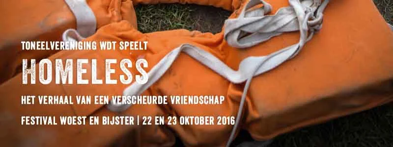 In het weekeinde van 22 en 23 oktober hoef je niet te kiezen tussen uitwaaien en van een voorstelling genieten. Een wandel- of fietsroute leidt je langs de 16 landschapskunstwerken en 8 locatietheatervoorstellingen van het festival Woest & Bijster. Toneelvereniging WDT speelt op dit festival de voorstelling ‘Homeless’, het verhaal van een verscheurde vriendschap.