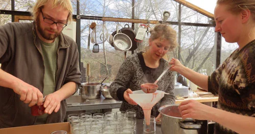 Vandaag hebben de stagiaires; Henk, Elske en Renée jam gemaakt! Superlekkere jam met allerlei verschillende ingrediënten. Bijvoorbeeld aardbeienjam met vanille óf met zwarte bes. Ook is er een heerlijke kweeperengelei met dadel en kaneel gemaakt hmmm… Dat wordt smullen! Het was een hele fijne, gezellige dag met regelmatig een zonnetje erbij!