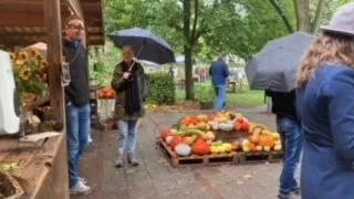 Ons oogstfeest op zaterdag kende helaas niet zulk lekker weer… Maar de bezoekes die het met paraplu en regelaarzen erop waagden waren niet teleurgesteld. Er waren hele leuke kraampjes van MergenMetz met lekkere worst van de varkens en eerlijke en heerlijke chocolade, Giel had allerlei gefermenteerd lekkers mee en veel DIY spullen. Tessy had een kraam vol leuke keramiekhes en bij GraanGeluk kon je bekroond bier proeven en super lokaal brood kopen. De schapenhouders hadden prachtige vachten bij zich en mensen konden hun eigen vilt-vachtje maken. Onder de tent waren ook Makandra , de imker en SlowFood aanwezig om mensen te vertellen over hun werk en lekkere honing en een prachtige lokale gort-lupine-groente salade te laten proeven. Onze winkel was een plaatje vol met oogst van ons en ook van onze oud-collega Pauline en nieuwe Wageningse groenteteler Edwin. En als pronkstuk natuurlijk de berg pompoenen die heel veel gefotografeerd is 🙂