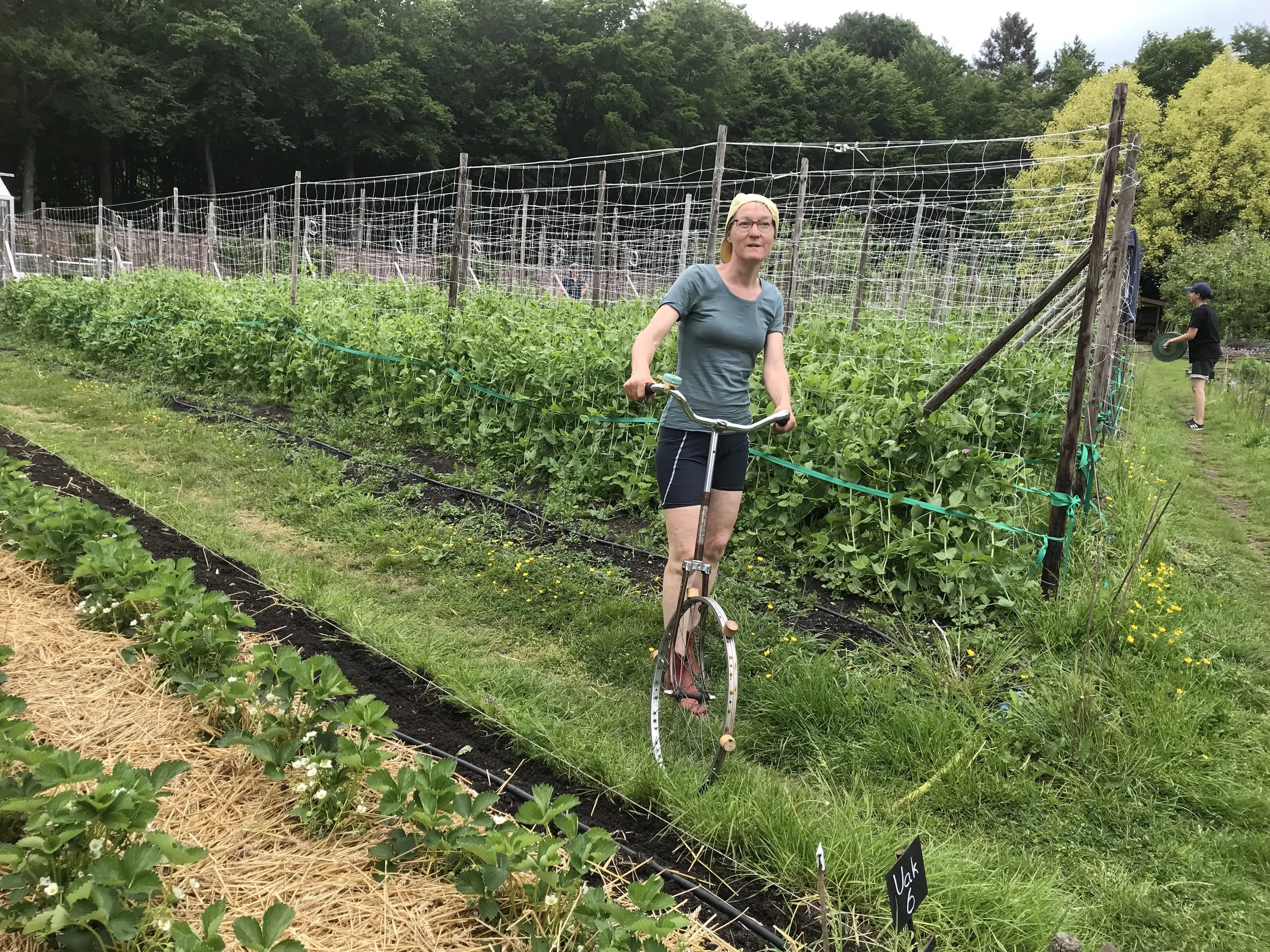 Vorige week hebben we heel veel plantgoed in de grond gezet. Het planten wordt nog leuker met onze plantfiets. Heleen had zelfs haar fietsbroek en petje ervoor opgezet ;-). Deze nieuwe ’tool’ heeft André gemaakt van een kinderfiets. Hij ging op zoek naar een wiel waar de omtrek matchte met onze plantafstanden. Het is een heel praktisch ding geworden waarvan je de afstanden tussen de blokjes kunt wijzigen. Om de 10, 20, 30, 45, 60 of 90 cm duwt deze fiets dan een blokje in de grond waardoor je precies weet waar je moet planten. Je moet natuurlijk wel een lijntje spannen om mooi recht te planten. En als iemand in de weg staat kun je ook nog bellen! 🙂
