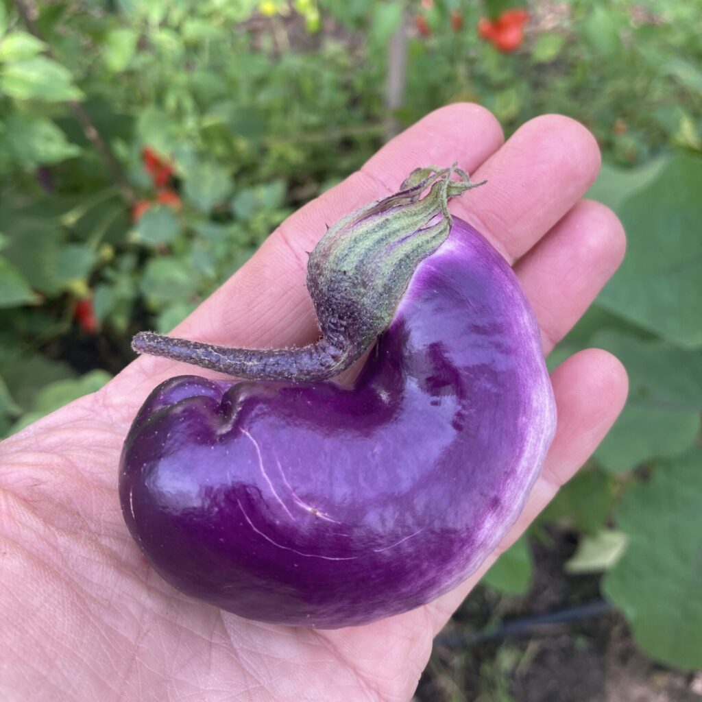 De aubergientjes zijn zo mooi. De mooiste van vandaag staat op de foto. Er zijn allerlei kleuren en vormen dit jaar. Belangrijk is om ze lang genoeg te laten stoven, bakken etc tot het vruchtvlees lekker zacht en romig is geworden.