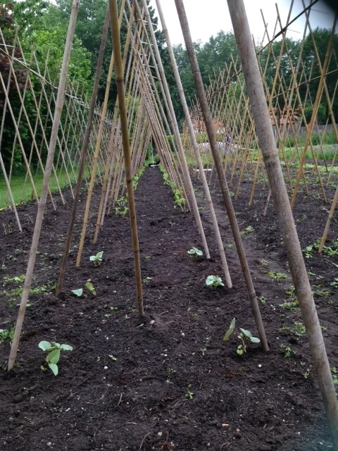 Deze week hebben we de bonen uitgeplant. Net voor de regen, dus die staat nu lekker te groeien. Allen kruis ik mijn vingers dat de slakken ze niet vinden. Die hebben in mijn pompoenenbed flink huisgehouden… zo’n 70% moest worden herplant of zelfs bijgezaaid. Ja ook in de ommuurde tuin zijn die beestjes soms een echte plaag.